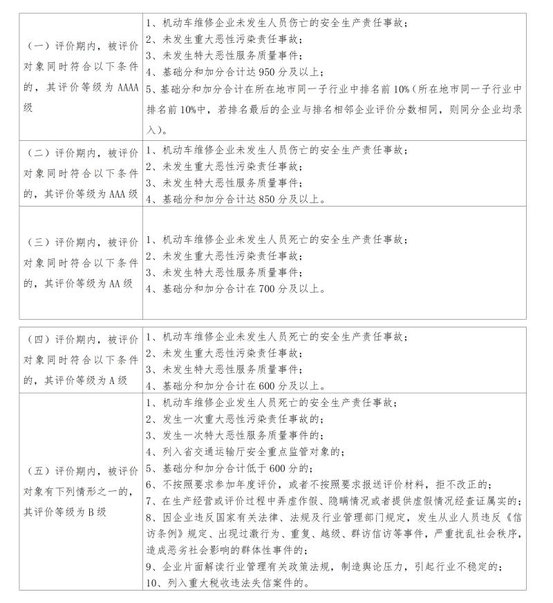 机动车维修企业诚信评价等级分为优秀、优良、合格、基本合格和不合格,分别用AAAA级、AAA级、AA级、A级和B级表示。